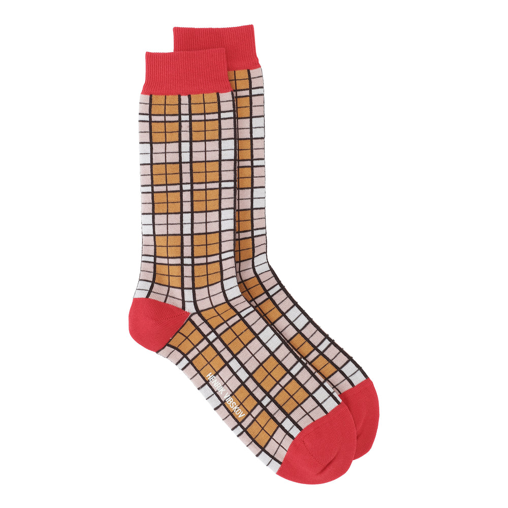 暖かい色味で構成されたチェック柄が印象的なクルー丈ソックス。