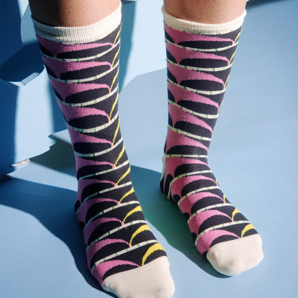 ユニークな柄をデザインしたアシンメトリーなクルー丈ソックス。