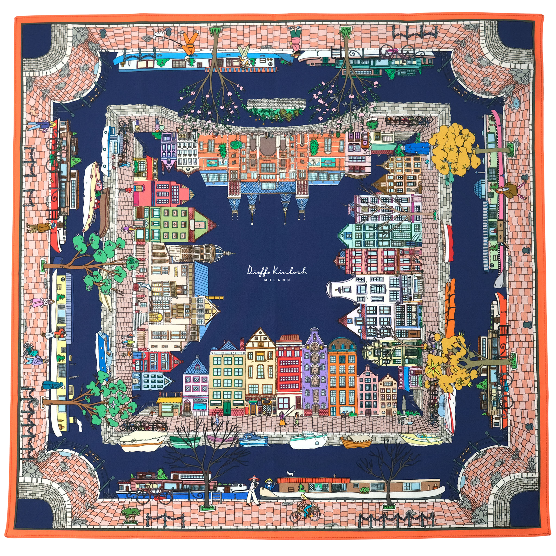 ネイビーベースにオランダ最大の都市アムステルダムの街並みをカラフルに描いたアイテム。