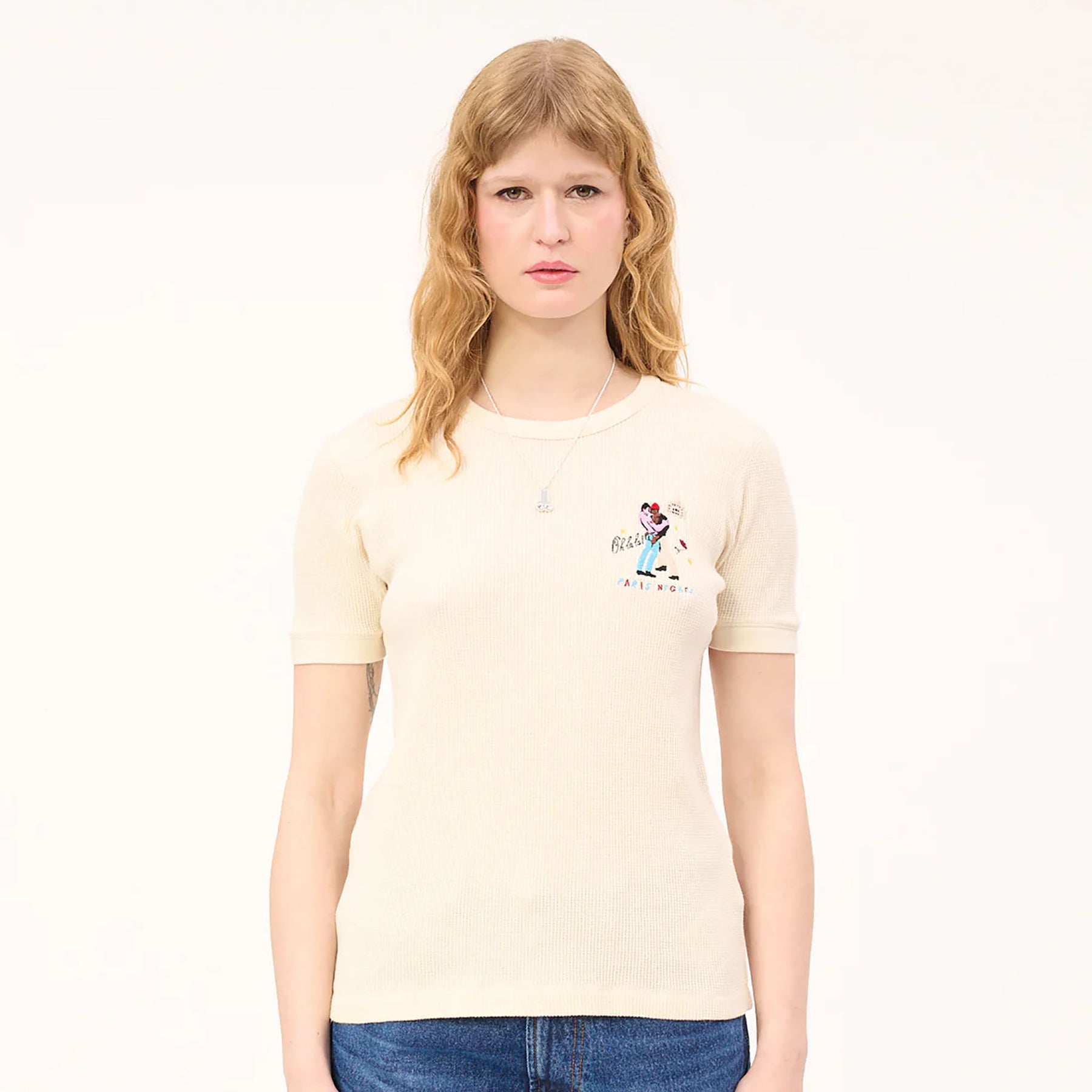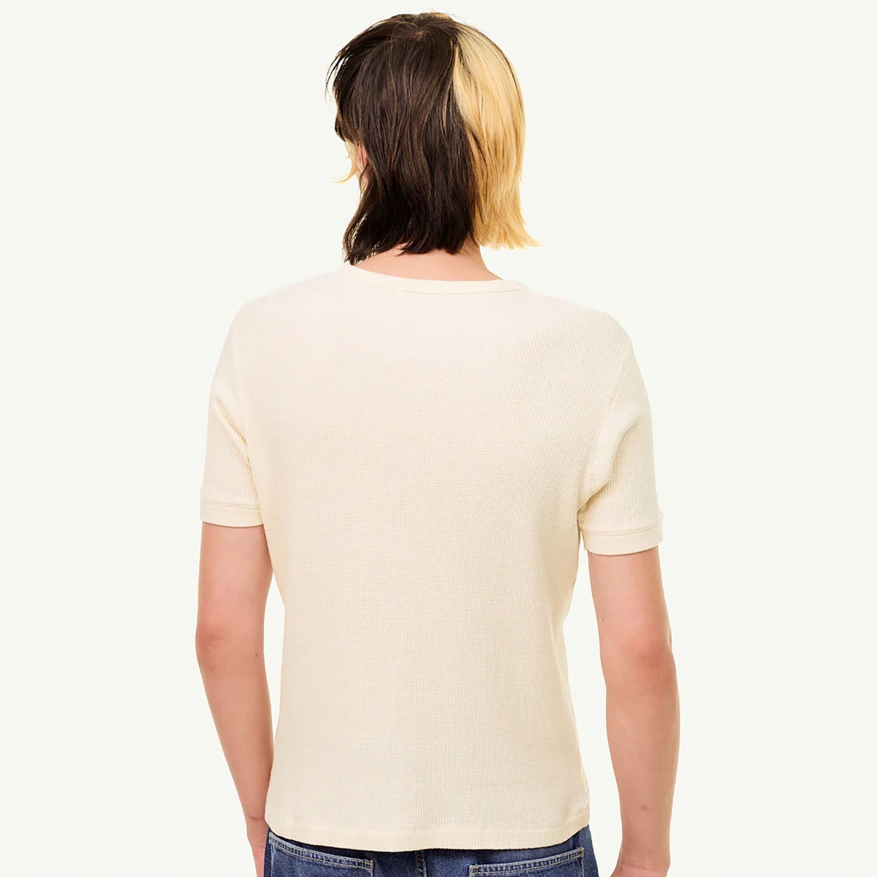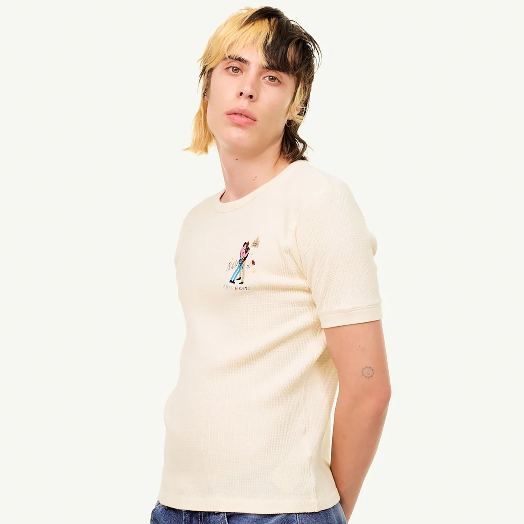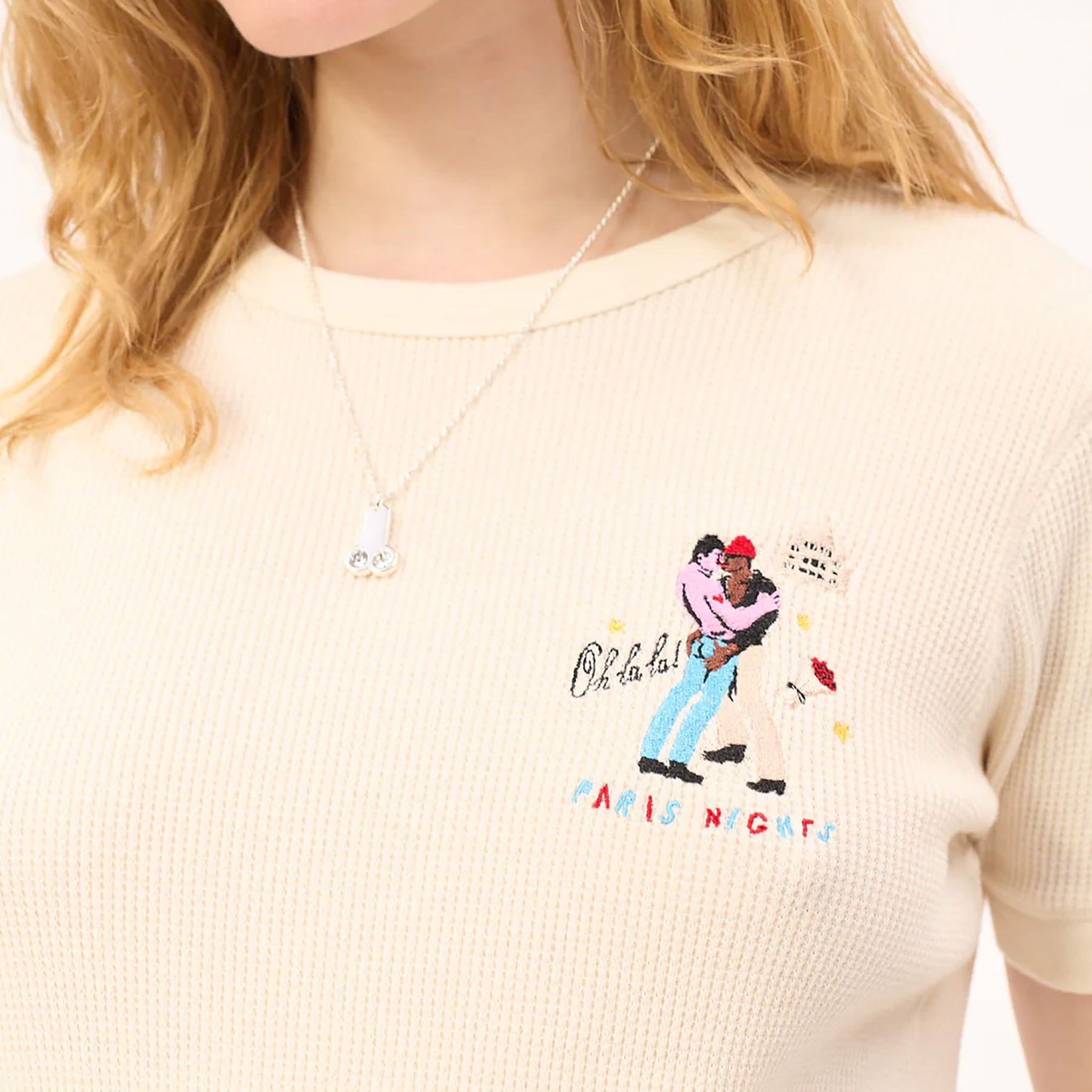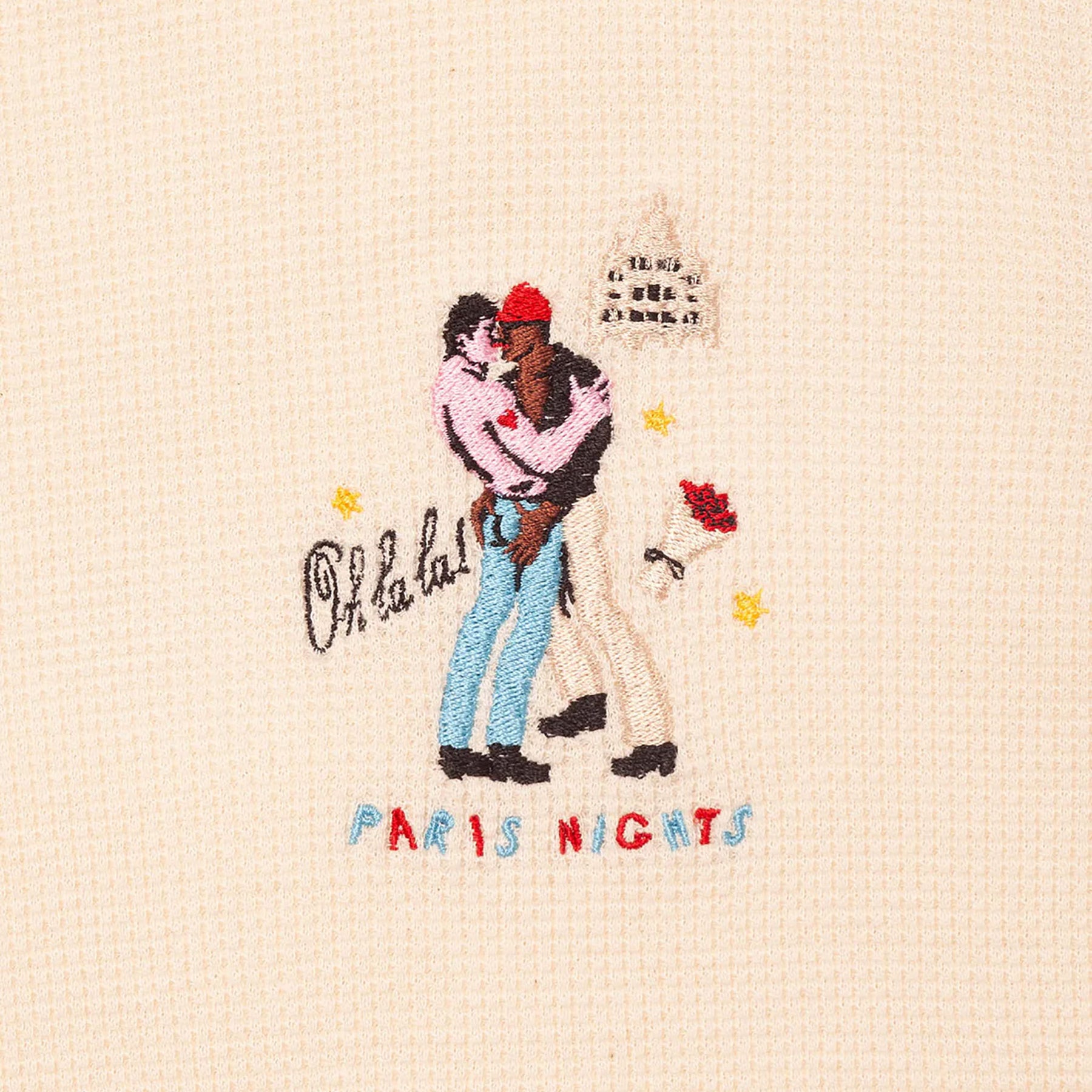 表情のあるワッフル地の胸元に、キャッチーな刺繍をあしらったデザイン。