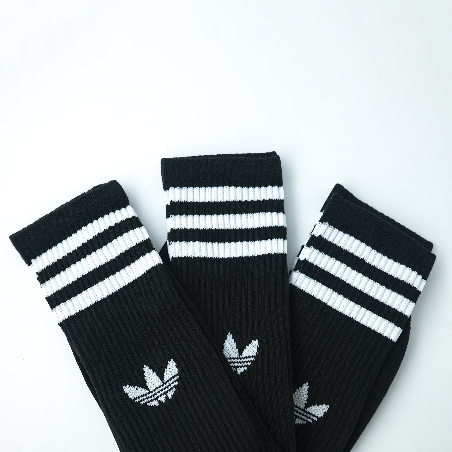 スリーストライプスとトレフォイルロゴをデザインしたハイクルー丈ソックス3足セット。